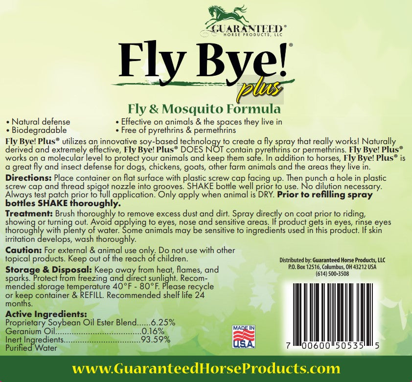 Keep your horse protected from biting insects day after day with the Fly Bye! Plus® Daily & Reserve Pack. This powerful pair combines a ready-to-use 32 oz spray bottle with a value-sized 2.5-gallon refill—perfect for daily use at the barn, shows, or on the trail. Formulated with naturally derived ingredients and no pyrethrins or permethrins, Fly Bye! Plus® delivers fast-acting, long-lasting fly protection while leaving your horse’s coat smooth and conditioned. Use the 32 oz bottle for easy application, then refill as needed for continuous coverage all season long.