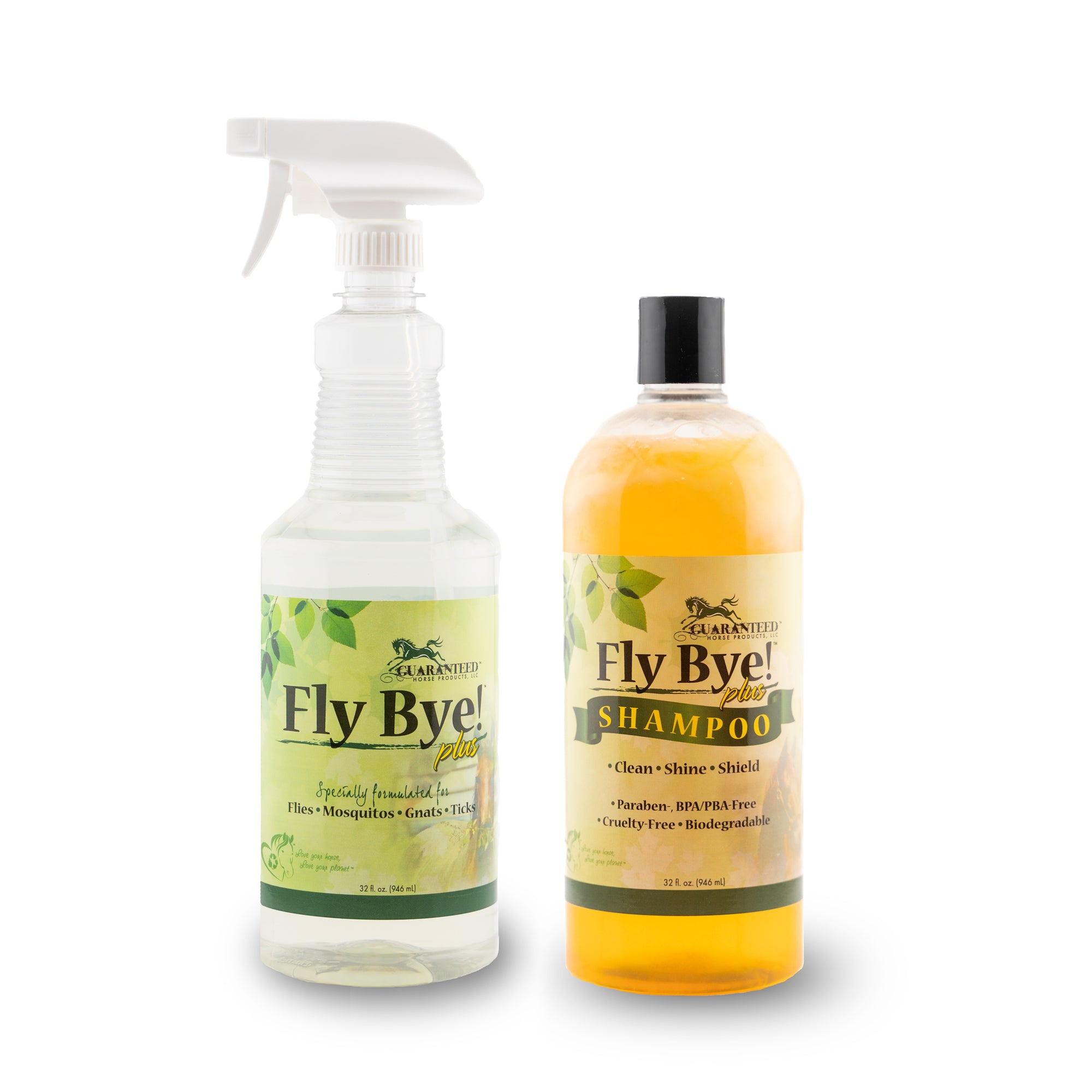 Shield your horse from pesky pests with our Fly Bye! Plus® Shine & Shield pack. This powerful combination includes a 32 oz Fly Bye! Plus® Fly Spray and a 32 oz Fly Bye! Plus® Shampoo, both formulated with natural, soy-based ingredients and geranium oil for effective, long-lasting fly protection. Our fly spray delivers on-the-spot relief, while the shampoo offers continued defense during bath time. Keep your horse clean, looking their best, and fly-free with this essential duo.